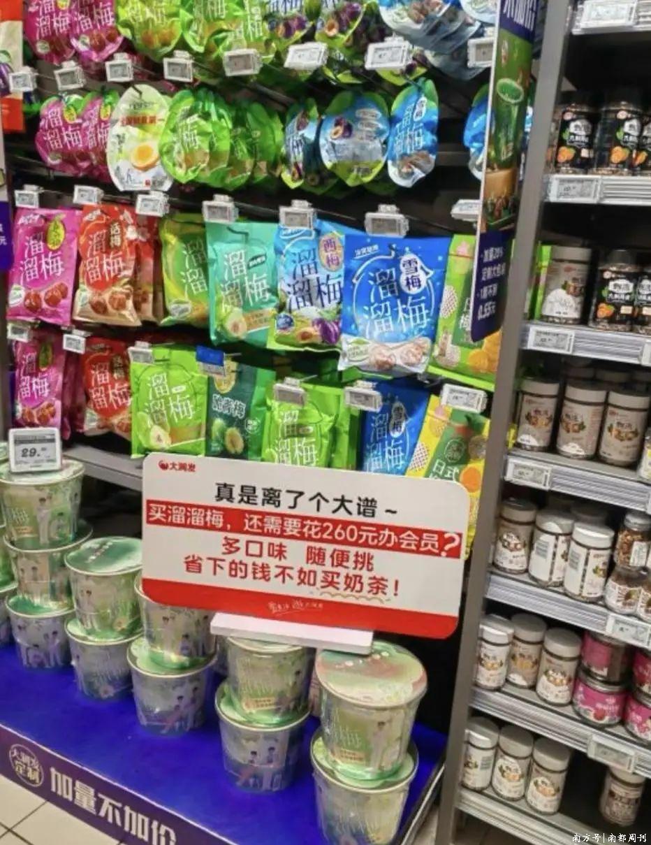 近日,有网友发帖称,大润发超市货架上贴有“某会员店同款”“买溜溜梅还需要花260元办会员”等标语,质疑是在“内涵”山姆会员商店。