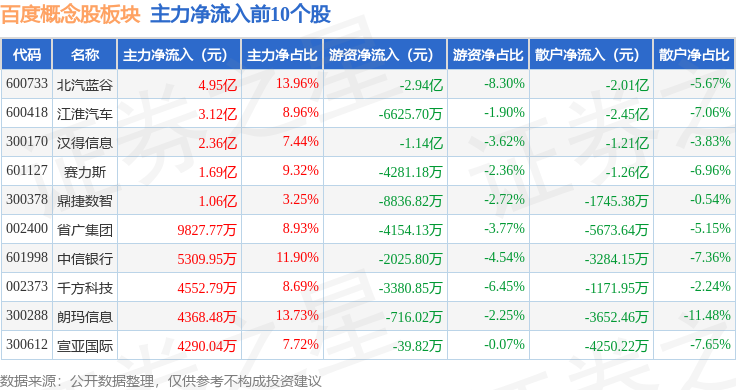 从资金流向上来看,当日百度概念股板块主力资金净流出1.74亿元,游资资金净流出5.8亿元,散户资金净流入7.54亿元。百度概念股板块个股资金流向见下表: