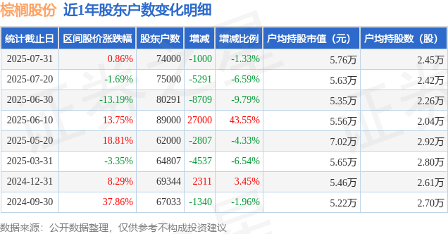 从股价来看,2025年7月20日至2025年7月31日,棕榈股份区间涨幅为0.86%,在此期间股东户数减少1000.0户,减幅为1.33%。