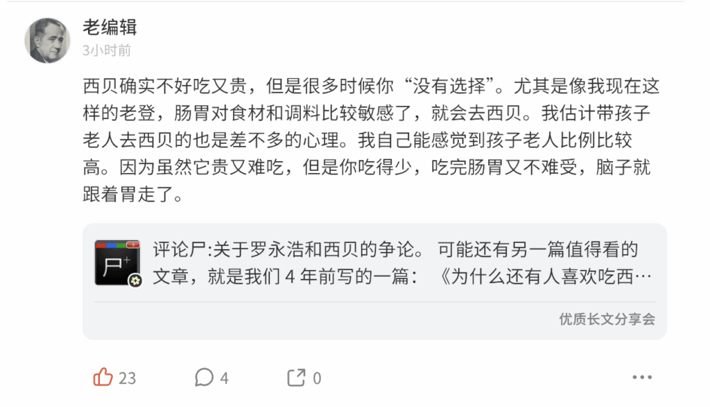 在即刻上关于这个话题的讨论截图里,不乏支持西贝的声音,尤其是老编辑那条评论,言简意赅: