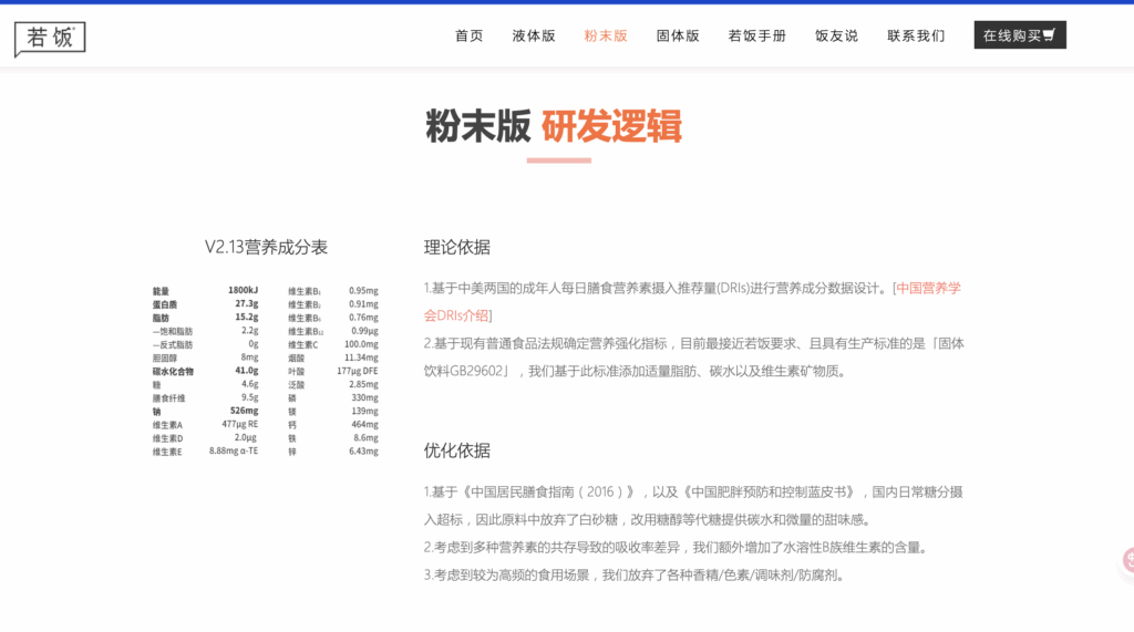 而若饭可能更冷门一点,这个是一个在 2015 年就推出的,模仿硅谷 Soylent 的人类饲料产品。它通过精准调配营养元素,将成人一餐所需要的宏观营养素和微观营养素调制成粉末、片剂或者罐装饮料,可以方便你在 3 分钟内完成一餐。